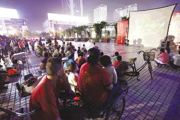8月28日晚,市民正在欣赏抗日电影。9月3日是中国人民抗日战争胜