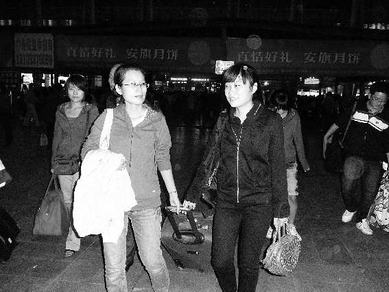志愿者孔丽君(前右)和孔会军(前左)姐妹俩走出兰州火车站。