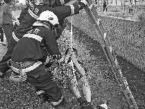 刘女士说,30日上午10点左右,消防队员赶到现场,两名消防队员依靠伸缩梯、救援绳等工具下到深沟中把这名男子救出。“头上有个大血窟窿,满脸都是血。”刘女士用手比划着伤口长度,足有十多厘米。