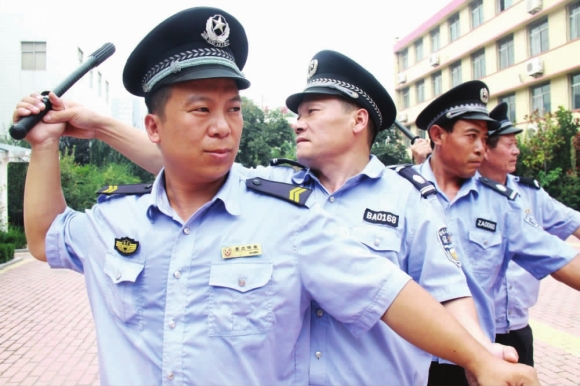 30日上午,在南湖小学校园内,学校的几名保安人员正在学习擒拿格斗以及警械的使用。据了解,新学期即将开始,为了强化保安人员处置突发事件的能力,南湖小学组织校内的多名保安人员进行为期两天的“素质”训练。