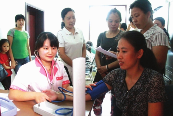 30日,在潍州路街道组织的女性健康体检现场,工作人员正在为健康街社区居民测血压时发现血压高者偏多。负责本次体检的王大夫告诉记者,现在高血压患者越来越多,其中一个很大的原因是饮食口味偏重,对油、盐的摄入量超标。