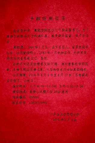 平阴县县委书记朱红方、县长朱云生的任前公示。