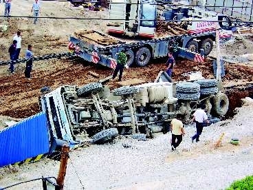 本报96706热线消息(记者陈朋)30日中午,山大路与文化东路交叉口,—辆水泥罐车想紧靠着文化路上的施工沟停靠,未料想施工沟的沟沿土层松动,致使罐车本身侧翻在沟中。所幸司机及时跳窗逃出,也没有伤及他人。
