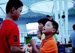 他们先是来到城市之窗馆。馆内有空中飞来飞去的天使、有天籁般的音乐、有来回变幻的城市场景。馆内的场景让五个小家伙很惊奇,老四李云轩说,哇,这么多城市都不一样啊,西班牙有斗牛,J本有和服,真好看。