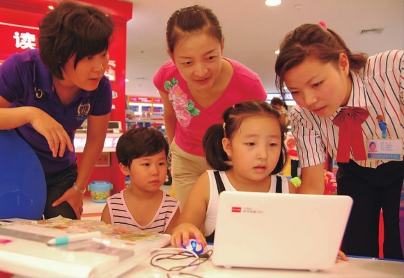 中小学即将开学,教辅书籍、电子数码产品、眼镜等与学生有关的商品开始热销。图为即将上三年级的果果正在银座商城选购英语学习机。