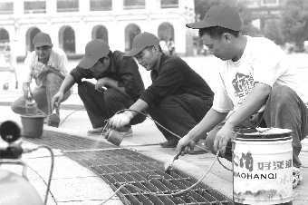 29日下午,在临沂人民广场,工作人员正在为喷泉池的铁架栏进行重新喷漆。为使人民广场这张城市名片更靓,广场管理处组织工作人员对广场的花草、霓虹灯、果皮箱、喷泉池以及其他破损的设施进行全面维护修理。