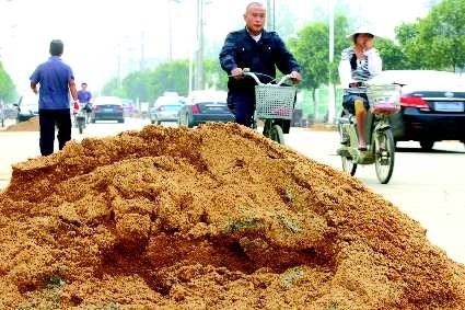 30日下午,在市区蒙山大道与银雀山路交会西100米处,十几堆黄土将马路两侧的非机动车道挡得严严实实,来往骑车的行人只能绕到机动车道上行驶,非常不便。记者廖杰摄