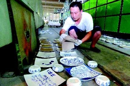 在即将举行的第八届书圣文化节上,市民除了可以观赏到众多纸质的书法作品外,还可以看到近百名全国知名书法家在陶瓷上创作的书法作品。第一批400多件书法陶瓷近日在山东银凤陶瓷集团出窑,其中60件展品将和来自景德镇的40件展品一起,参加书圣文化节开幕式的主题展出。图为工人在整理刚刚出窑的书法瓷器。