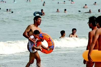 29日,在第三海水浴场,—名儿童不情愿地被家长从海中抱出来。据介绍,连