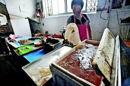 在威海水产批发市场1卖海蜇的业户讲1市场上的海蜇都是从外地运进的。