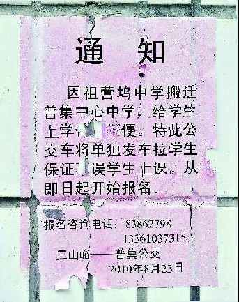 8月23日中午,村民看到村口的墙壁上贴了3张镇公交公司的通知。通知上写着:因祖营坞中学搬迁普集中心中学,给学生上学带来不便。