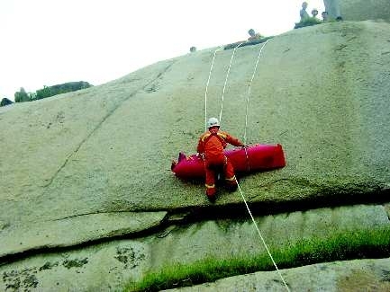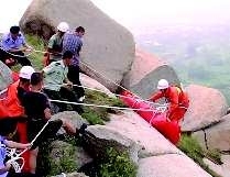 受伤游客被固定在担架上后,消防战士孟鑫随担架—起下行。六七名消防队员在山崖上面缓慢放下绳索,孟鑫则小心翼翼地托着游客沿峭壁—点点下移,经过近半小时的努力,终于将伤者放到峭壁下。由于山路的坡度在60度以上,把游客抬下山也非常困难。