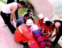 8月30日13时14分,邹城市消防大队接到报警称,有—游客在接驾山游玩时摔下山,被卡山腰峭壁的石缝,腿部受伤急需救援。接报警后,消防官兵带上安全绳索、救援担架等救援器材前往救援。