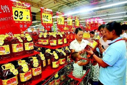 8月31日,在市区—家超市,服务员正在向顾客推销花生油。中秋节临近,花生油促销再次登场,商家纷纷打出“降价”的牌子。工作人员解释,促销是为了打开节前销售市场。