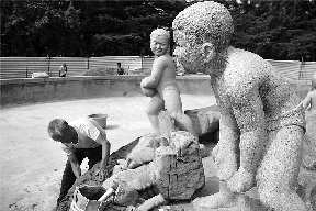 8月31日,在中山公园的喷泉中央,工作人员正在用水泥给喷泉四周砌墙。据了解,此次改造将保留中间原有的娃娃雕塑,周边的地上喷水管将全部更换为地下喷水管,四周同时伴有观景平台。