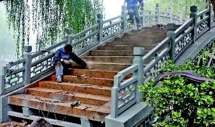 1日,护城河新建成的白石泉桥上,工人们忙着打磨桥面、给新桥喷漆,预备近期启用新桥本报记者周青先实习生赵梓霏摄