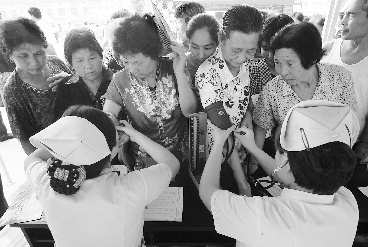1日上午,济宁市第~人民医院的“心连心”健康直送车开进汶上县杨店乡王村,济宁市委宣传部、济宁市第~人民医院组织的医疗专家队为村民免费看病体检,并宣传疾病预防知识。图为村民们正在接受义诊。 本报记者张晓科本报通讯员翟睿摄