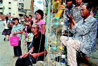 在肿瘤中心病房一楼大厅外,停放着两辆消防车,不少消防队员进进出出,非常忙碌。消防车后的一处堆满石子和砖块的水泥地上,三名医护人员正忙着为身旁的患者打针换药。患者们有的坐在轮椅上,有的直接坐到地上,每名患者身边都站着一名高举输液袋的家属。