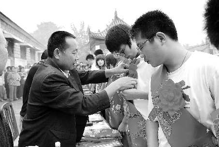 伴随噼里啪啦的鞭炮声和高李小学鼓号队的演奏,村里新考上大学的18名学生上台披红戴绿,接受祝贺,他们的父母也都获得了“教子有方好家长”的奖状。
