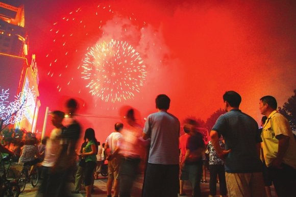 1日,在潍坊市白浪河边,一场绚丽的焰火盛会吸引了众多市民驻足观看。在鲁台会期间,为了营造更加热烈的节日氛围,潍坊市于当日晚8点在白浪河两岸举行主题为“绚丽鲁台会,映耀两岸情”的焰火晚会。