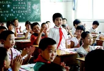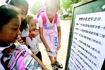 9月1日上午8时许,刚刚入学的小学生在看班级分布说明,找自己的班级位置。 记者廖杰摄