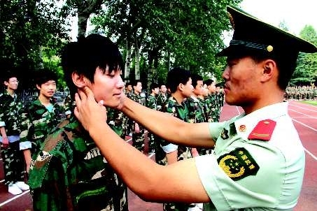 ▲9月1日上午,临沂第一中学的2010级新生在操场军训,教官正在给新生规范动作。军训是高一新生的第一堂课,