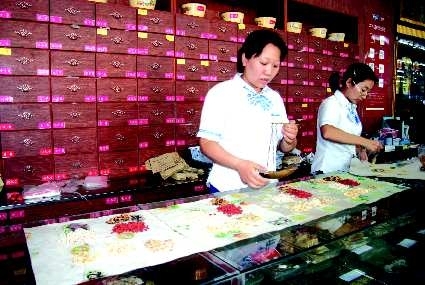 9月1日,人民广场地下一大药房里,工作人员在称、配中药。据了解,近段时间,三七、金银花、胖大海等中药药材价格普遍上涨,原材料减产和市场需求量大是主要原因。