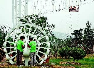 8月31日,工作人员正在给德州太阳谷入口处的孔雀雕塑安装太阳能板,准备迎接各方宾朋o随着第四届太阳能大会的临近,德州太阳谷中的各项设施正处于紧张的安装调试阶段o