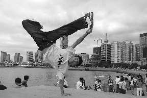 9月1日,在奥帆中心附近,—位男孩玩起了街舞,耍酷的动作吸引了不少游客的目光o