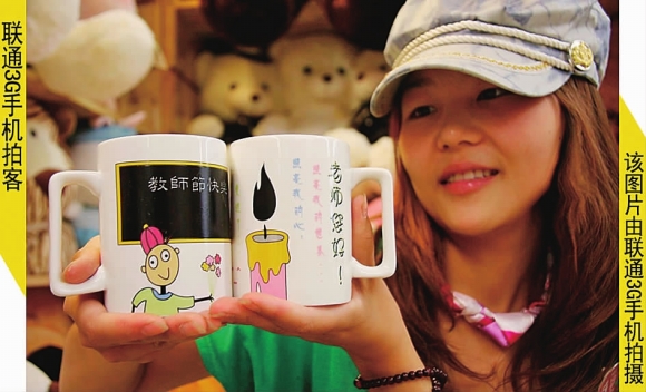 9月1日,在龙潭路一家时尚百货店,销售人员展示带有“教师节快乐”字样的卡通杯。临近教师节,各种充满感恩之意的低价位小礼物受到学生的青睐。