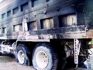 8时左右,记者赶到现场,看到一辆满载石子的重型货车停在昌润南路城市主人小区门口,货车向西轻微倾斜,左侧后半部车身烧黑,左后侧的四个轮胎被烧毁,其中有的轮胎烧得掉了皮,货车底下湿漉漉一片,起火轮胎距油箱最近距离仅有30厘米左右。