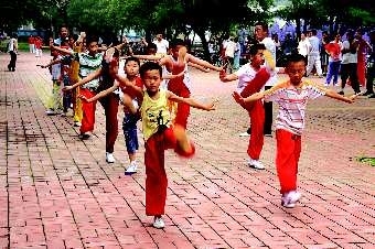 说明:孩子们假期中不顾天气炎热,在教练的指导下习武