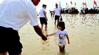 9月5日,2010中国·垦利红光第二届赶海拾贝旅游节在东营市垦利县黄河入海口举行。千余名游客一齐观看渔家传统祭海仪式,渔船列队表演,然后一同乘船出海,体会初秋赶海拾贝的乐趣。图为游客正在亲手捡拾海贝。