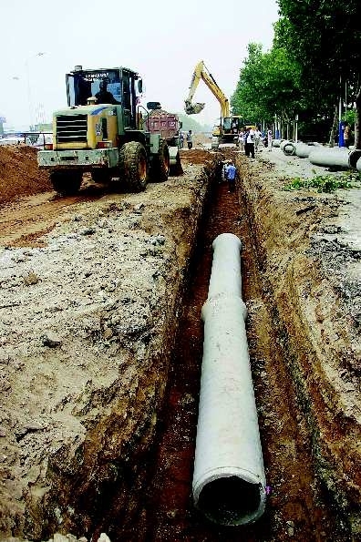 5日,烟台市市政养护管理处的工作人员正在铺设管道o当日,烟台市机场路改造工程正式开工建设o据了解,该工程由烟台市城市排水管理处和烟台市市政养护管理处共同承担改造,预计11月竣工通车o 本报记者 刘新 摄影报道
