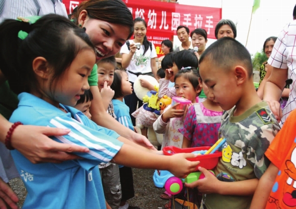 4日,在潍坊市安丘辉渠镇中峒峪小学,小学生们收到了潍坊市奎文区外国语幼儿园小朋友送来的玩具。这次活动是潍坊市奎文区外国语幼儿园、高新区英皇国际幼稚园联合学生家长共同组织的,他们不但为山区的学生送去了玩具,还有价值1万多元的教材。