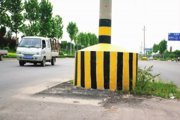 5日,在潍坊市玉清西街月河路西段,短短300米的马路上就有7个大水泥墩。有路人表示,由于这里没有路灯,到了晚上光线很不好,这几个水泥墩挡在路中间,行人非常容易发生事故,希望有关部门能尽快处理一下,以免发生危险。 本报记者 孙国祥 摄影报道