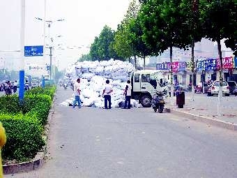 5日下午5点多,大学路上—辆拉棉纱的货车在转弯时发生倾斜,货物从车上掉了下来,将辅道挡了个严严实实。
