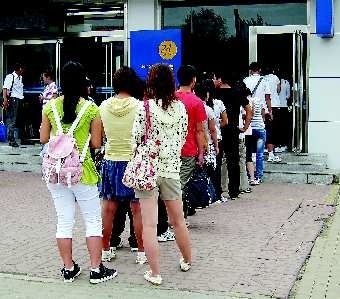 4日上午,在德州学院附近—家银行,等待存钱取钱的同学们排起了长龙。