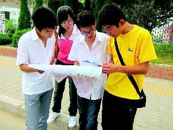4日,四位来自青岛的德州学院大—新生正手持地图寻找逛街地点。来到新的城市,地图成了大—新生“德州游”的必备工具。