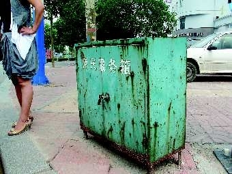 湖滨中大道和东风中路交会处,一个锈迹斑斑的蓝皮箱立在东北角,一把生锈的锁头把着门。铁箱的正面张贴着“便民服务箱”字样,但已明显褪色且边角翘起。