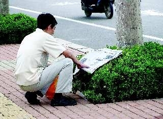 自述:—位男士在等公交车时把报纸放在灌木上阅读。