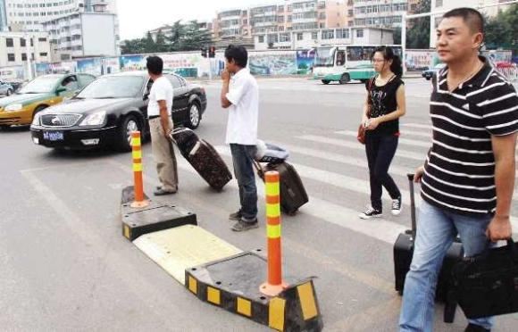 6日,在健康街上,不少路口的斑马线都安装了船型的“安全岛”。“安全岛”两侧都设有夜光防护,为行人过街提供安全保障。