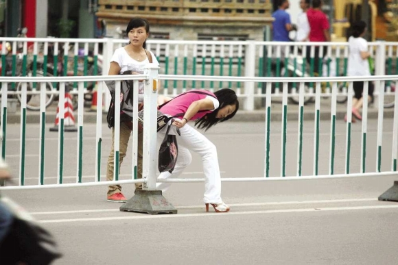 6日,在潍坊市胜利街温州购物商城附近,路人正钻过道路中间的隔离栏。该路段下设地下通道,但是有市民还是图方便冒险穿过隔离栏。
