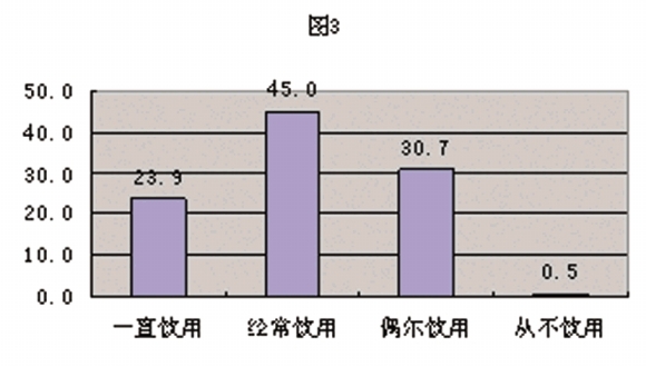 在所有参与调查活动的消费者中,有23.9%的消费者表示自己一直饮用低度浓香型的白酒产品(如图3所示),经常饮用的比例占45%,偶尔饮用的占30.7%,从不饮用的仅占0.5%。这一数据结果与前文山东白酒消费的饮用习惯中分析相一致,即浓香型白酒,中低度白酒是山东白酒消费市场的主流。