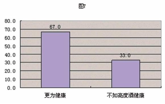 在本次调查活动中,有67%的消费者认为饮用低度浓香型白酒更加健康(如图7所示),33%的消费者认为低度酒不如高度酒健康,显示出低度浓香白酒的消费群体在整个白酒消费市场中占据主要地位。