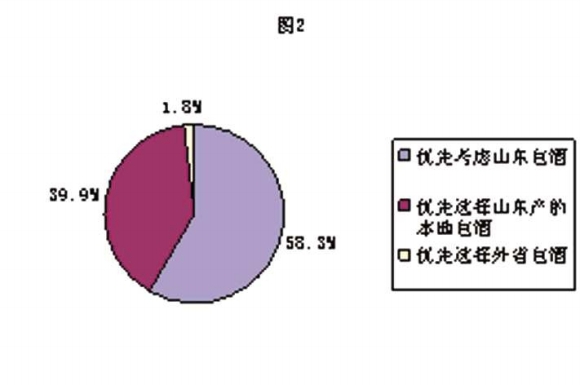 反映在购买行为上,58.3%的消费者表示在购买低度浓香型白酒时会优先考虑山东白酒产品(如图2所示),39.9%的消费者更具体的指出了倾向于选择山东产的本地白酒,选择购买外省白酒的比例仅占1.8%。这一数据反映出约有98%的消费者在选择低度浓香型白酒产品时选择了鲁酒产品,鲁酒低度浓香型产品在省内市场形成了近乎垄断的地位。