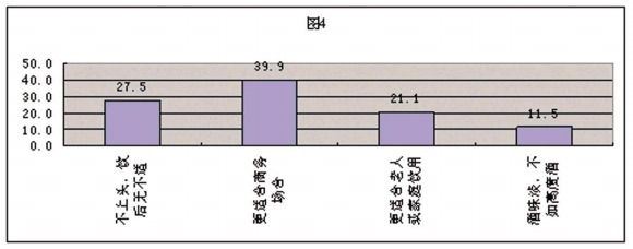 通过以上数据可以看出,38度是大多数消费者比较满意的低度浓香型白酒的酒精度。这一度数与国外大多数蒸馏酒的酒精度大体一致,也是我国白酒降度最初达到的水平,技术积累和工艺水品最为纯熟,因此其产品品质在低度酒中也是最为稳定和成熟的。此外,经过30多年的发展,白酒降度、低度酒生产的技术已基本成熟,但追求酒精度过低和口感过于柔和也与目前主要消费群体的消费习惯不相符合(选择30度以下的低度浓香白酒的消费者比例仅占13.8%)。因此38度左右的低度浓香型白酒是一个较为理想的平衡点,既达到了白