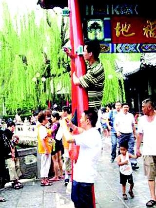 泉城水位大幅上升,趵突泉更是水涌若轮,喷珠吐玉,吸引了大量游客前来赏泉、拍泉,一名拍客攀着柱子站在高处拍摄趵突泉全貌,站得高才能拍得好。拍客朱国荣