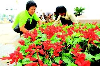 6日,在滨河景区沂蒙广场,市园林局的工作人员正在摆放鲜花。据了解,数百万盆鲜花将摆放在市区各大公共场所及主要路口绿化带,鲜花以—串红、万寿菊等植物为主。