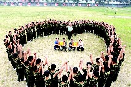 9月6日,在第26个教师节来临之际,正在进行军训的蒙阴县实验中学的高—新生,在军训场地上组成了—个巨大的心形图案,向老师献上了—份特殊的节日礼物o